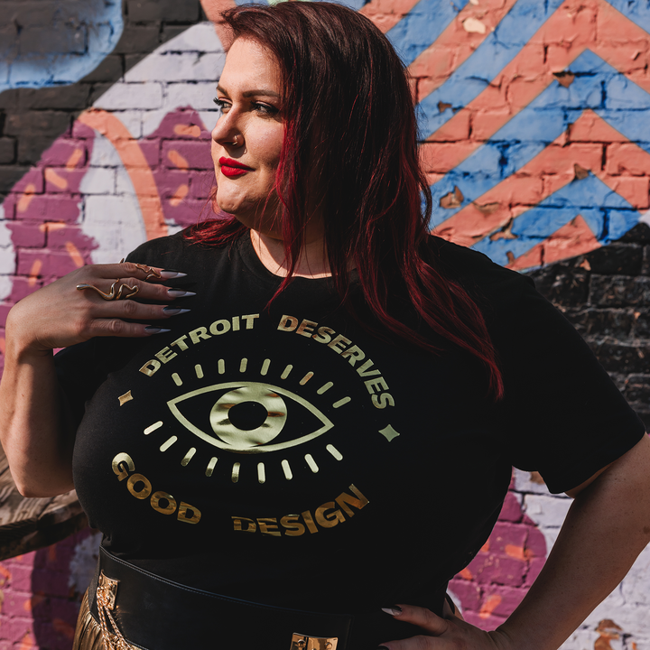 Featuring a striking gold foiled eyeball emblem -- symbolizing protection and abundance for our creative community -- this shirt is a proud declaration that our city and our people are worth it.